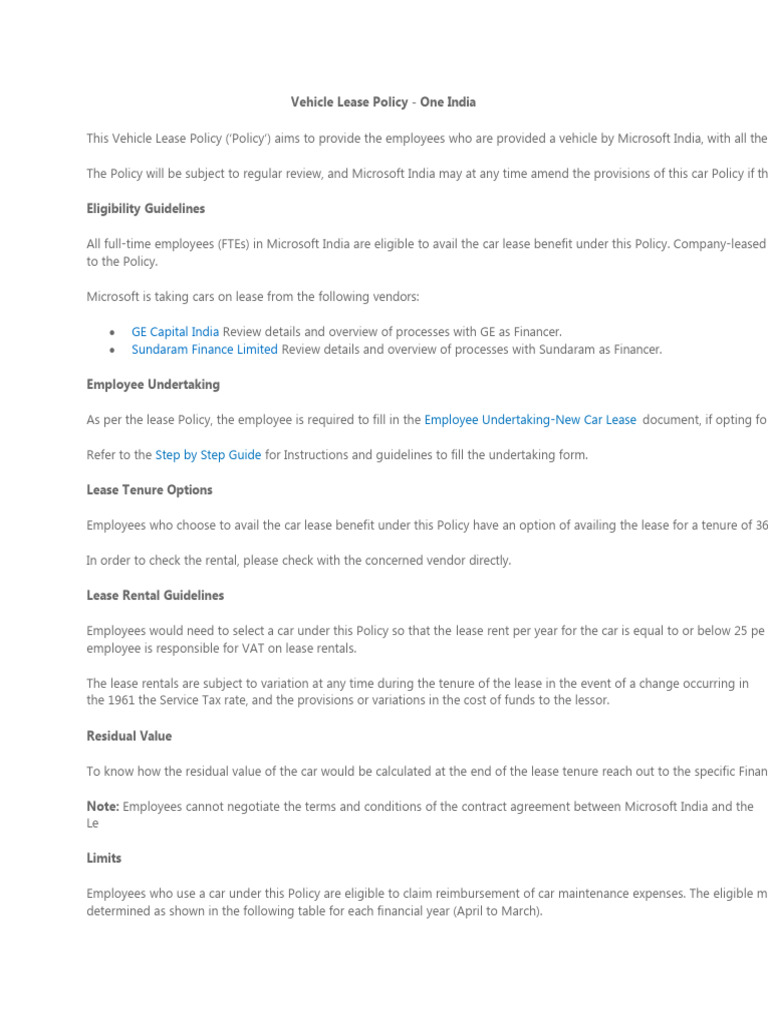 This Vehicle Lease Policy (‘Policy’) aims to provide the employees who are provided a vehicle by Microsoft India, with all the