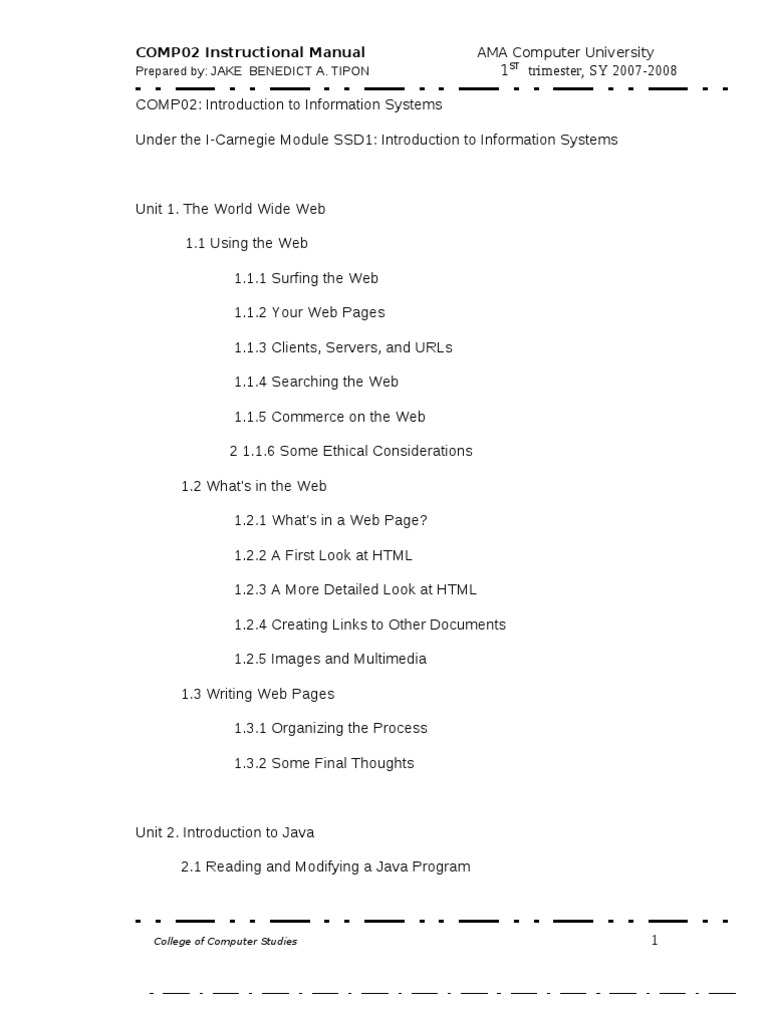 Unit 1. The World Wide Web 1.1 Using the Web 1.1.1 Surfing the Web 1.1.2 Your Web Pages 1.1.3 Clients, Servers, and URLs 1.1.4 Searching the Web 1.1.5 Commerce on the Web 2 1.1.6 Some Ethical Considerations 1.2 What's in the Web 1.2.1 What's in a Web Page? 1.2.2 A First Look at HTML 1.2.3 A More Detailed Look at HTML 1.2.4 Creating Links to Other Documents 1.2.5 Images and Multimedia 1.3 Writing Web Pages 1.3.1 Organizing the Process 1.3.2 Some Final Thoughts