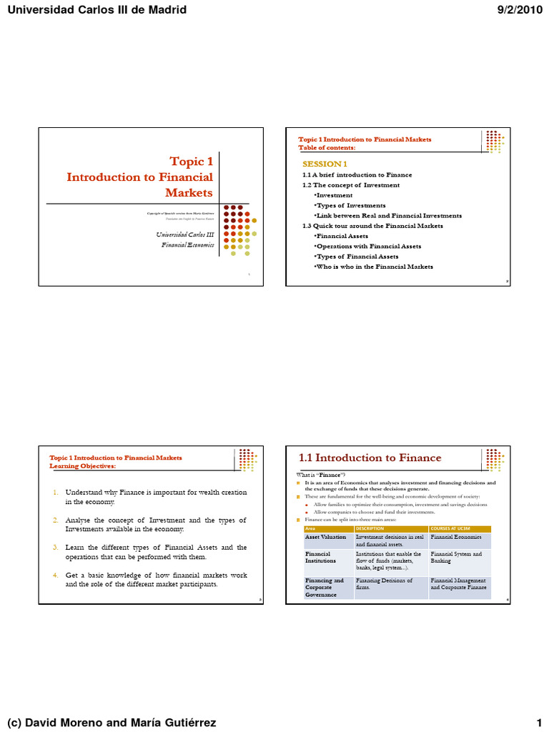 Investments available in the economy. Area DESCRIPTION COURSES AT UC3M