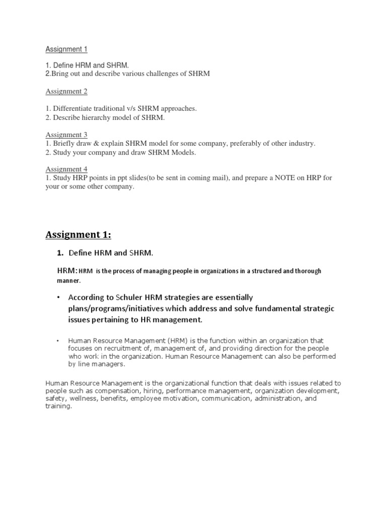 Assignment 2 1. Differentiate traditional v/s SHRM approaches. 2. Describe hierarchy model of SHRM. Assignment 3 1. Briefly draw & explain SHRM model for some company, preferably of other industry. 2. Study your company and draw SHRM Models. Assignment 4 1. Study HRP points in ppt slides(to be sent in coming mail), and prepare a NOTE on HRP for your or some other company.