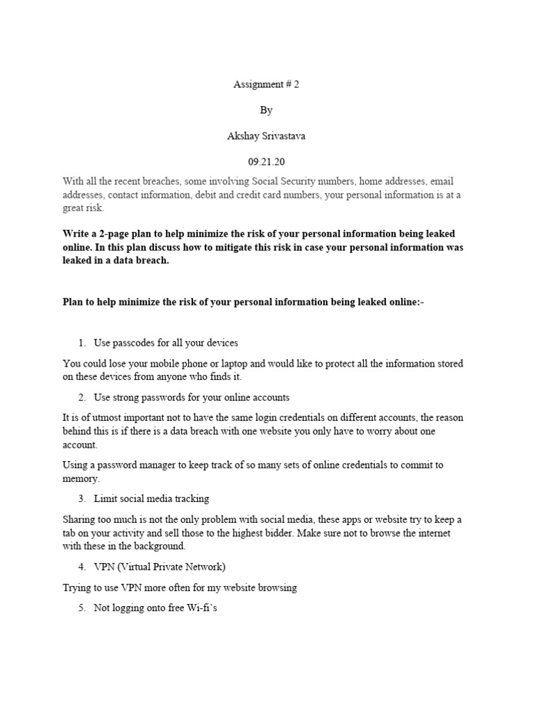 Write a 2-page plan to help minimize the risk of your personal information being leaked