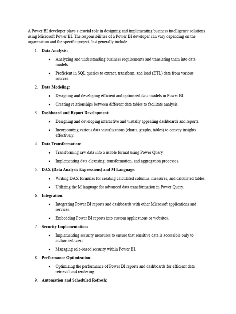 using Microsoft Power BI. The responsibilities of a Power BI developer can vary depending on the