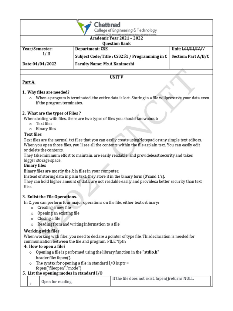 Subject Code/Title : CS3251 / Programming in C Section: Part A/B/C