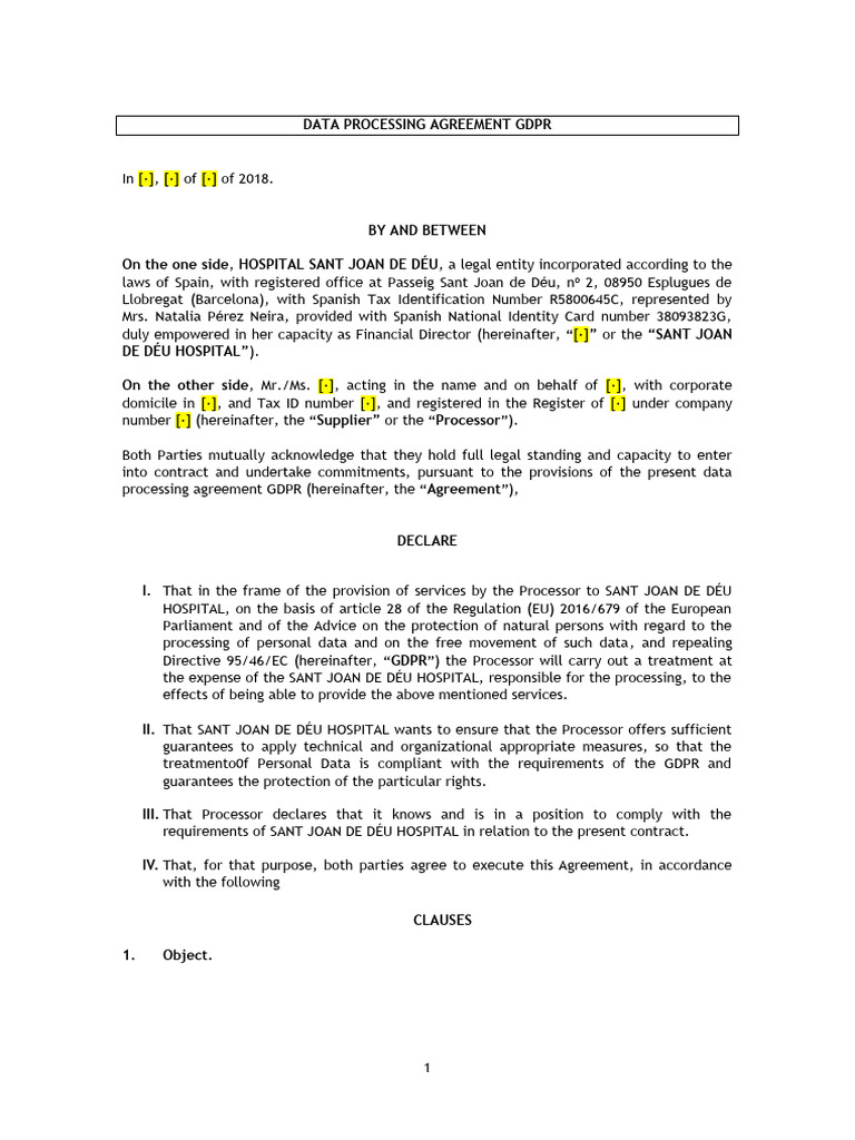 JOAN DE DÉU HOSPITAL, only for the purpose object of this Contract. Processor