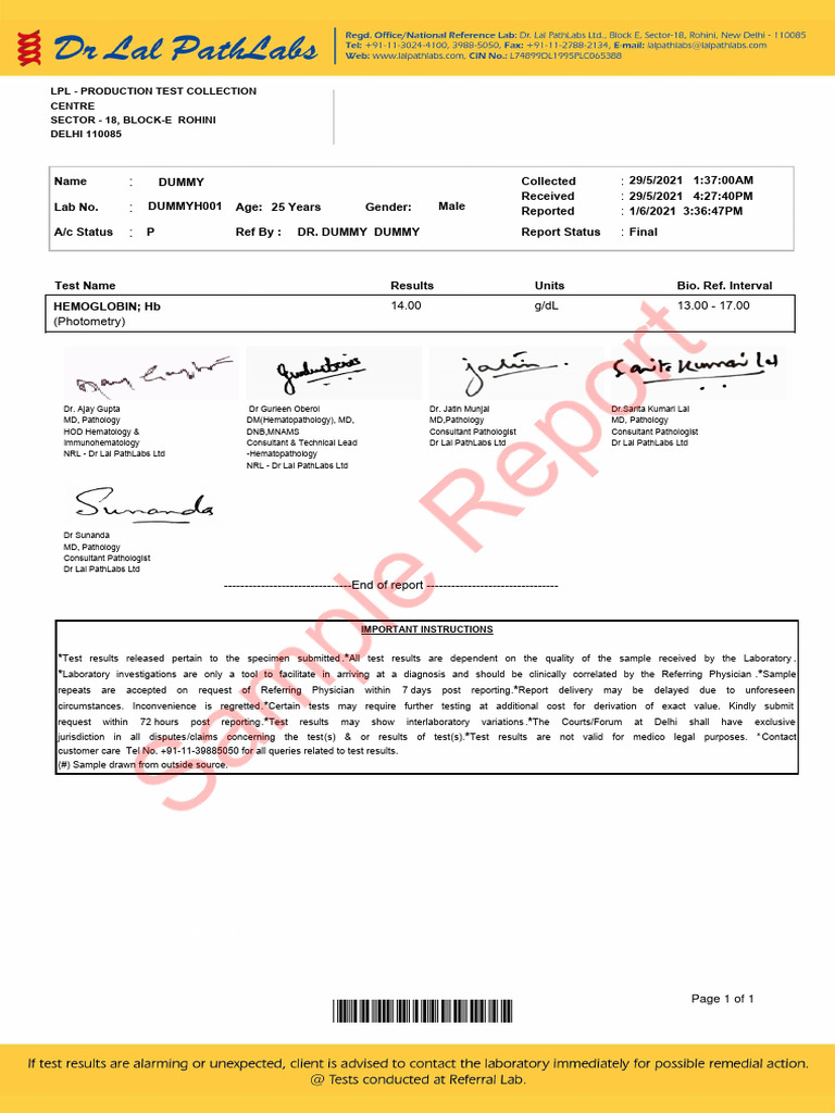 Lab No. : DUMMYH001 Age: 25 Years Gender: Male Reported : 1/6/2021 3:36:47PM