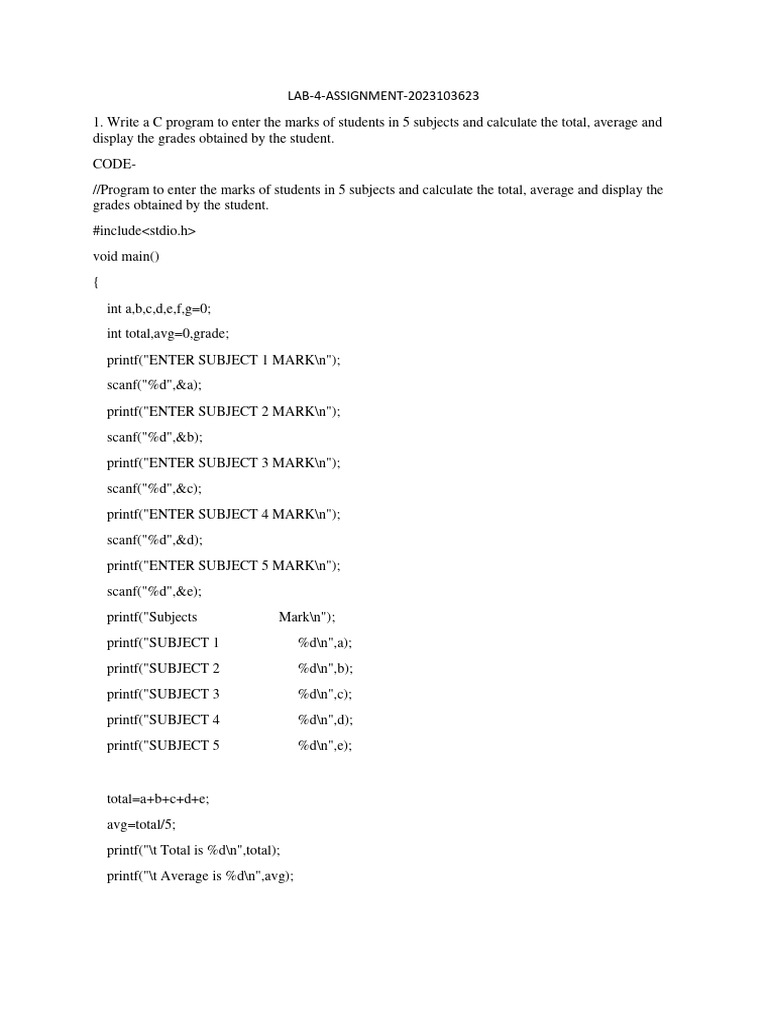 1. Write a C program to enter the marks of students in 5 subjects and calculate the total, average and