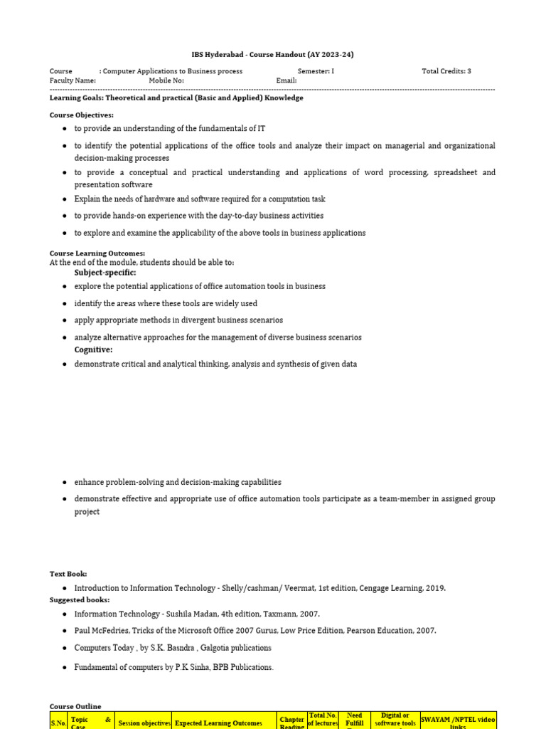 Course : Computer Applications to Business process Semester: I Total Credits: 3