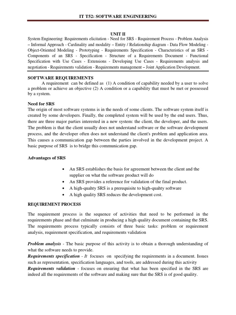 UNIT II System Engineering: Requirements elicitation - Need for SRS - Requirement Process - Problem Analysis Informal Approach - Cardinality and modality Entity / Relationship diagram - Data Flow Modeling Object-Oriented Modeling - Prototyping - Requirements Specification - Characteristics of an SRS Components of an SRS - Specification - Structure of a Requirements Document - Functional Specification with Use Cases - Extensions - Developing Use Cases - Requirements analysis and negotiation - Requirements validation - Requirements management Joint Application Development.