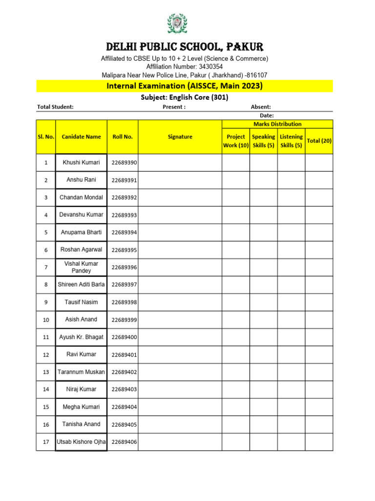 Sl. No. Canidate Name Roll No. Signature Project Speaking Listening