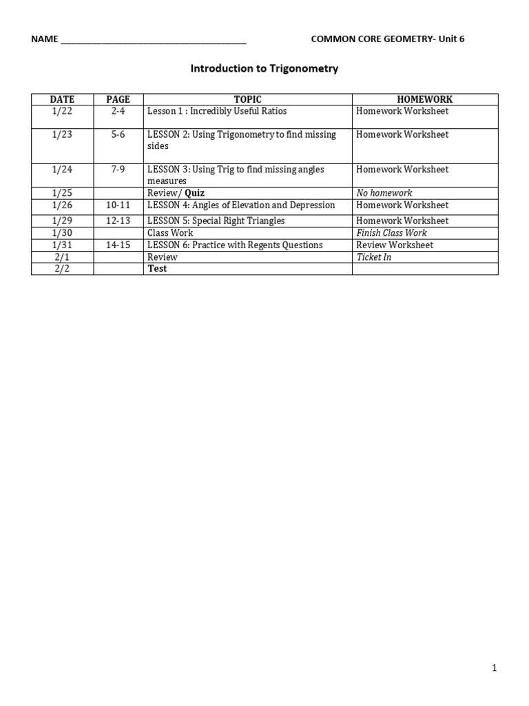 1/26 10-11 LESSON 4: Angles of Elevation and Depression Homework Worksheet