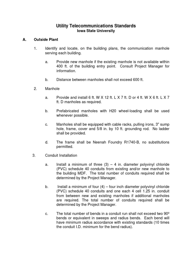 c. Manholes shall be equipped with cable racks, pulling irons, 3" sump