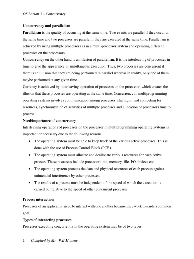 Mutual exclusion: During the course of their execution two or more concurrent processes