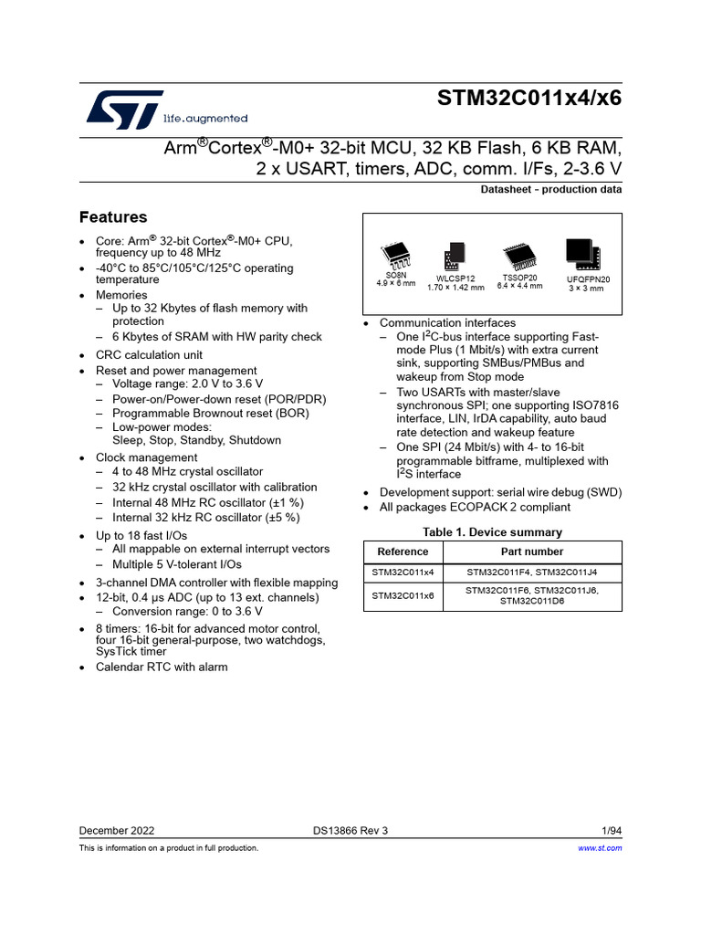 STM32C011x4/x6: Arm Cortex - M0+ 32-Bit MCU, 32 KB Flash, 6 KB RAM, 2 X USART, Timers, ADC, Comm. I/Fs, 2-3.6 V