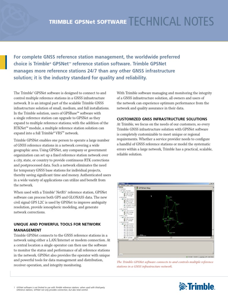 Trimble GPSNet reference station software provides total control in a GNSS network. as an integral part of the scalable Trimble GNSS infrastructure solution, GPSNet enables clients to grow their infrastructure solution as their business needs expand. with unique and powerful tools for network management and reference station control, GPSNet offers service providers and users complete confidence in the performance of the network and the integrity of their data.