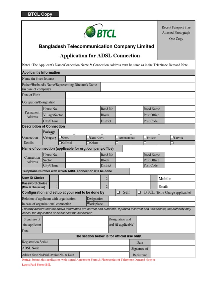 Note1: The Applicant's Name/Connection Name & Connection Address must be same as in the Telephone Demand Note. Applicant's Information Name (in block letters) : Father/Husband's Name/Representing Director's Name (in case of company) Date of Birth Occupation/Designation House No. Permanent Address Village/Sector City/Thana Description of Connection Package Connection Details Category