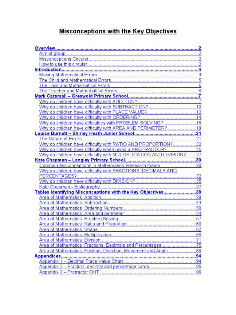 Contributors to this circular include Mark Carpmail Greswold Primary School Louise Burnett Shirley Heath Junior School Kate Chapman Langley Primary School Donna Crowder Primary Maths Consultant, SIAS This circular contains Information on why children make errors in the different areas of mathematics. Misconception tables outlining possible misconceptions for the key objectives in most strands of the National Numeracy Framework from Reception to Year 6, key questions for each objective to discover difficulties and ideas for next step activities to overcome problems. In some cases, where there are no key objectives for some year groups, general objectives have been included to show progression within the table. However, misconceptions or next step activities may not have been identified for these objectives.