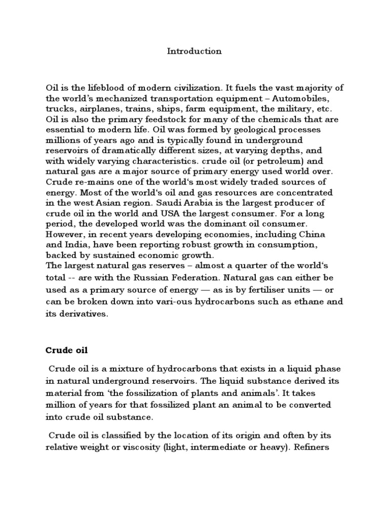 Oil is the lifeblood of modern civilization. It fuels the vast majority of the worlds mechanized transportation equipment Automobiles, trucks, airplanes, trains, ships, farm equipment, the military, etc. Oil is also the primary feedstock for many of the chemicals that are essential to modern life. Oil was formed by geological processes millions of years ago and is typically found in underground reservoirs of dramatically different sizes, at varying depths, and with widely varying characteristics. crude oil (or petroleum) and natural gas are a major source of primary energy used world over. Crude re-mains one of the worlds most widely traded sources of energy. Most of the worlds oil and gas resources are concentrated in the west Asian region. Saudi Arabia is the largest producer of crude oil in the world and USA the largest consumer. For a long period, the developed world was the dominant oil consumer. However, in recent years developing economies, including China and India, have been reporting robust growth in consumption, backed by sustained economic growth. The largest natural gas reserves almost a quarter of the worlds total -- are with the Russian Federation. Natural gas can either be used as a primary source of energy as is by fertiliser units or can be broken down into vari-ous hydrocarbons such as ethane and its derivatives.