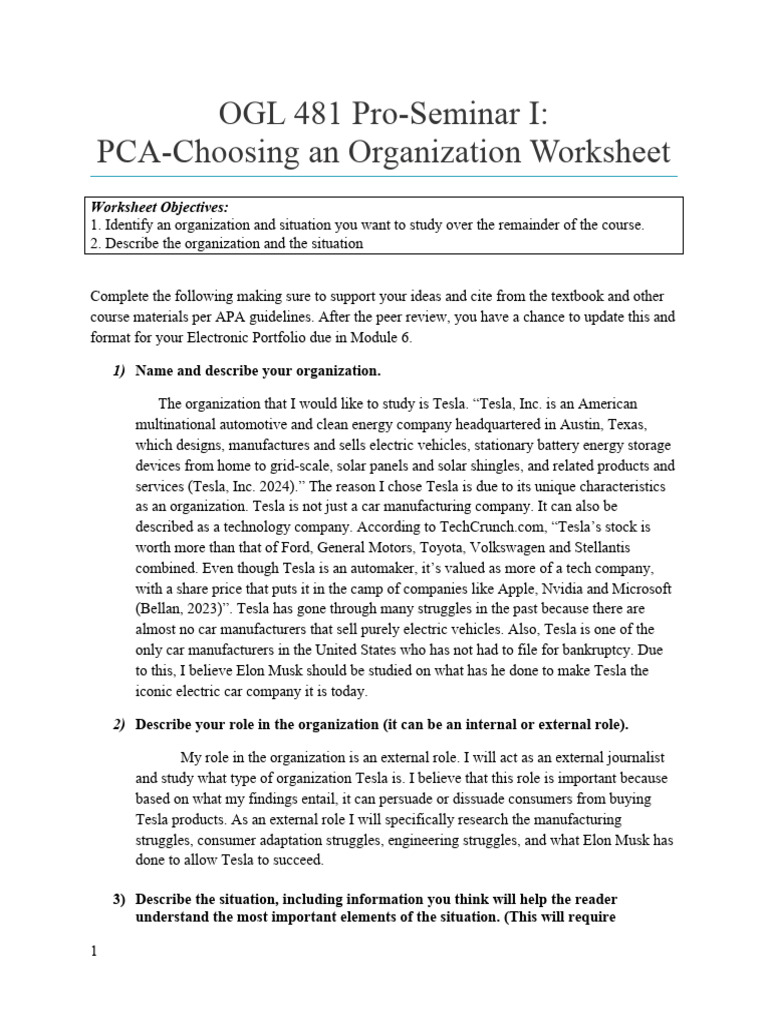 services (Tesla, Inc. 2024).” The reason I chose Tesla is due to its unique characteristics