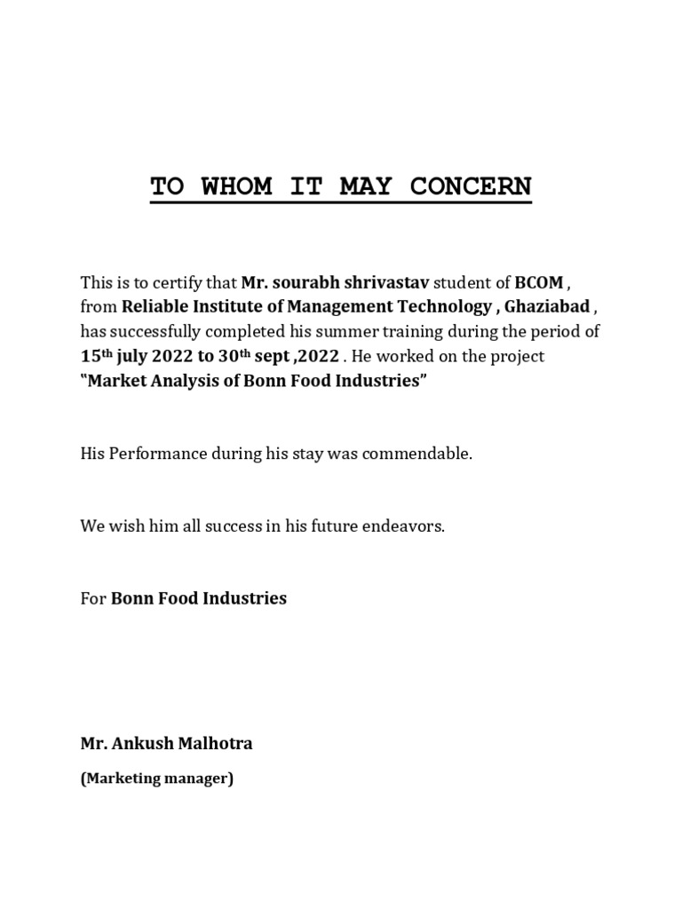This is to certified that this project ‟Market Analysis of Bonn food Industries”