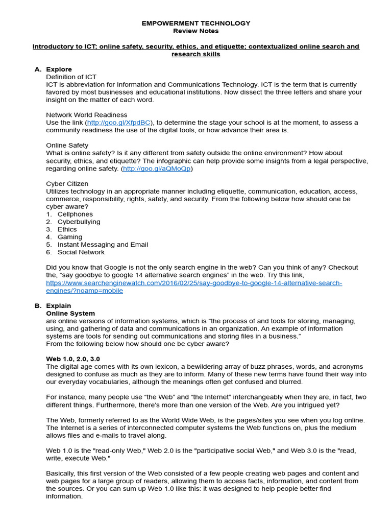 Introductory to ICT; online safety, security, ethics, and etiquette; contextualized online search and