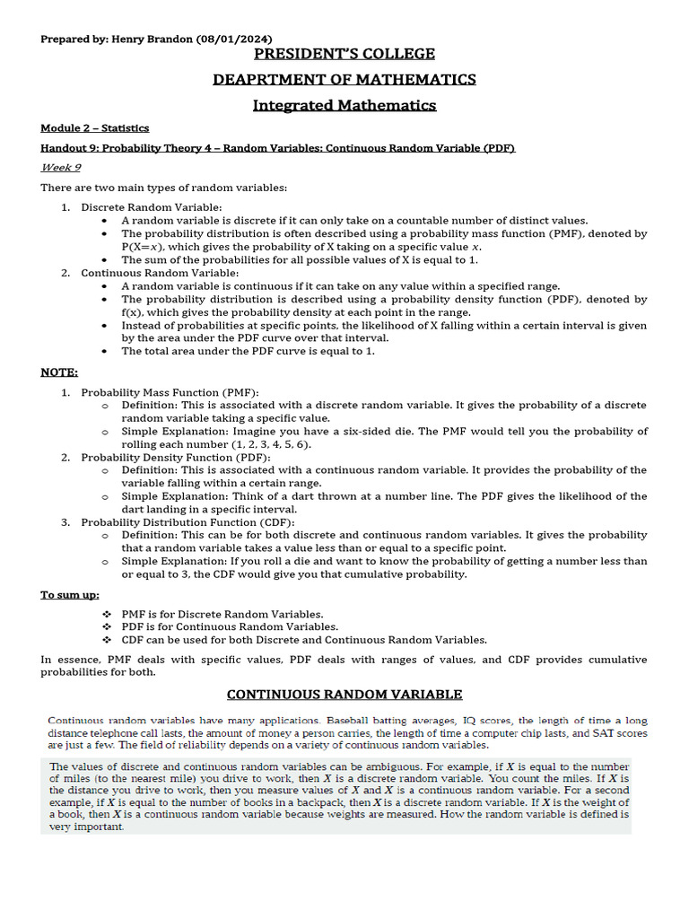 Handout 9: Probability Theory 4 – Random Variables: Continuous Random Variable (PDF)