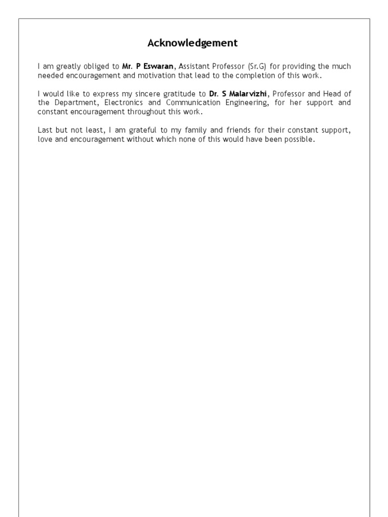 I am greatly obliged to Mr. P Eswaran, Assistant Professor (Sr.G) for providing the much needed encouragement and motivation that lead to the completion of this work. I would like to express my sincere gratitude to Dr. S Malarvizhi, Professor and Head of the Department, Electronics and Communication Engineering, for her support and constant encouragement throughout this work. Last but not least, I am grateful to my family and friends for their constant support, love and encouragement without which none of this would have been possible.