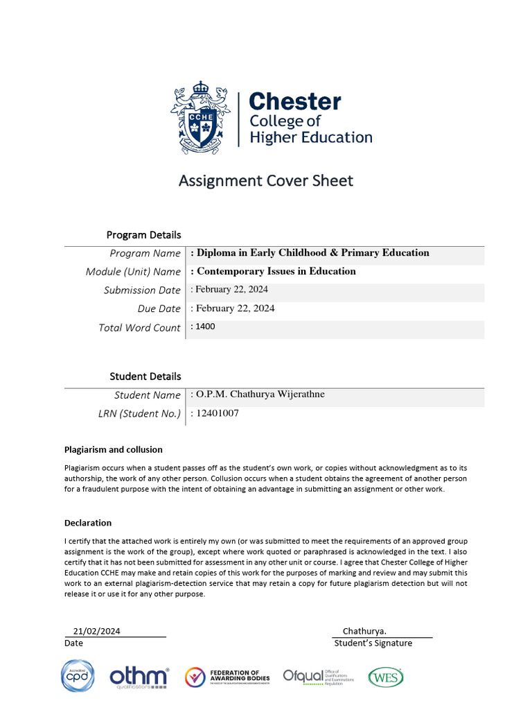 certify that it has not been submitted for assessment in any other unit or course. I agree that Chester College of Higher