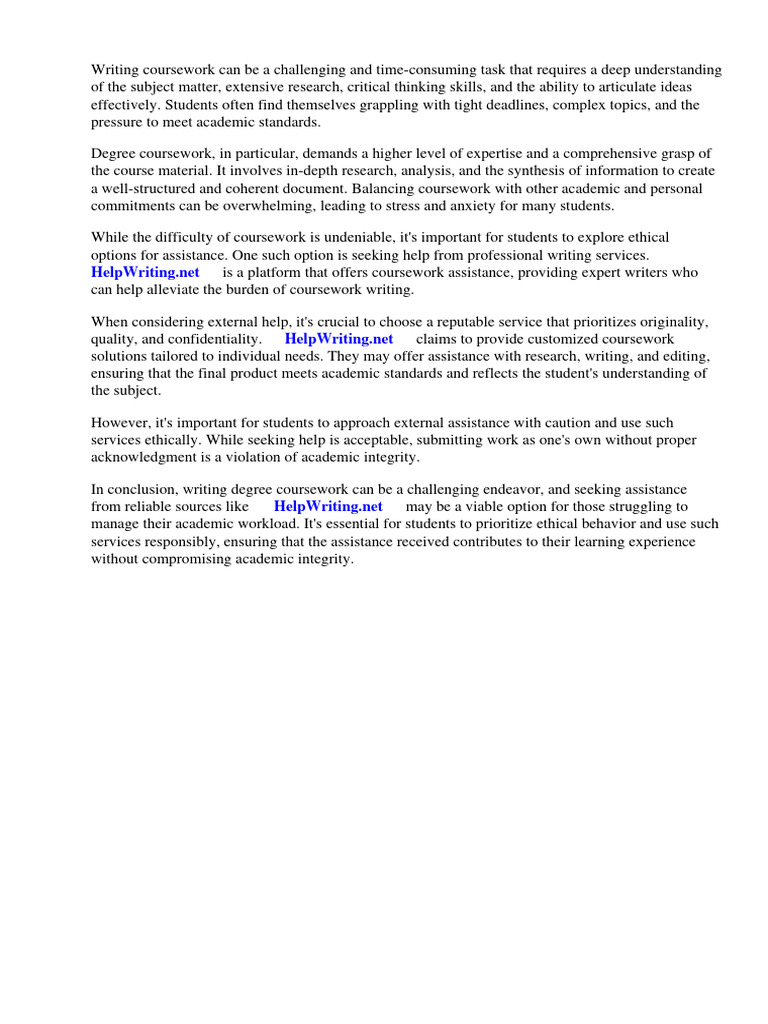 Writing degree coursework can be a challenging endeavor that requires extensive research, critical thinking, and balancing academic and personal commitments. Seeking assistance from reliable sources like HelpWriting.net may help students manage their workload, but it is important to approach external help cautiously and use such services ethically by properly acknowledging any assistance received. Students should prioritize original work that reflects their own understanding while meeting academic standards.