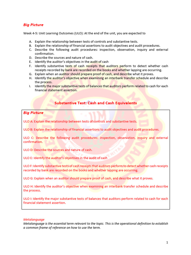 ULO I: Identify the major substantive tests of balances that auditors perform related to cash for each