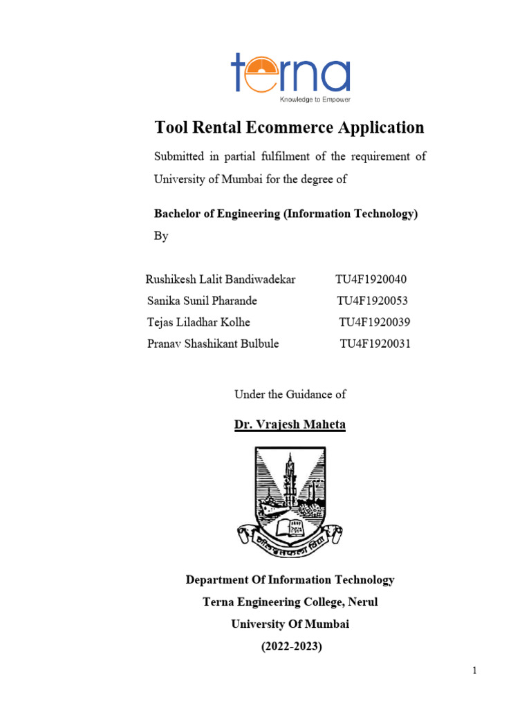 This is to certify that the project entitled “Tool Rental Ecommerce Application” is a