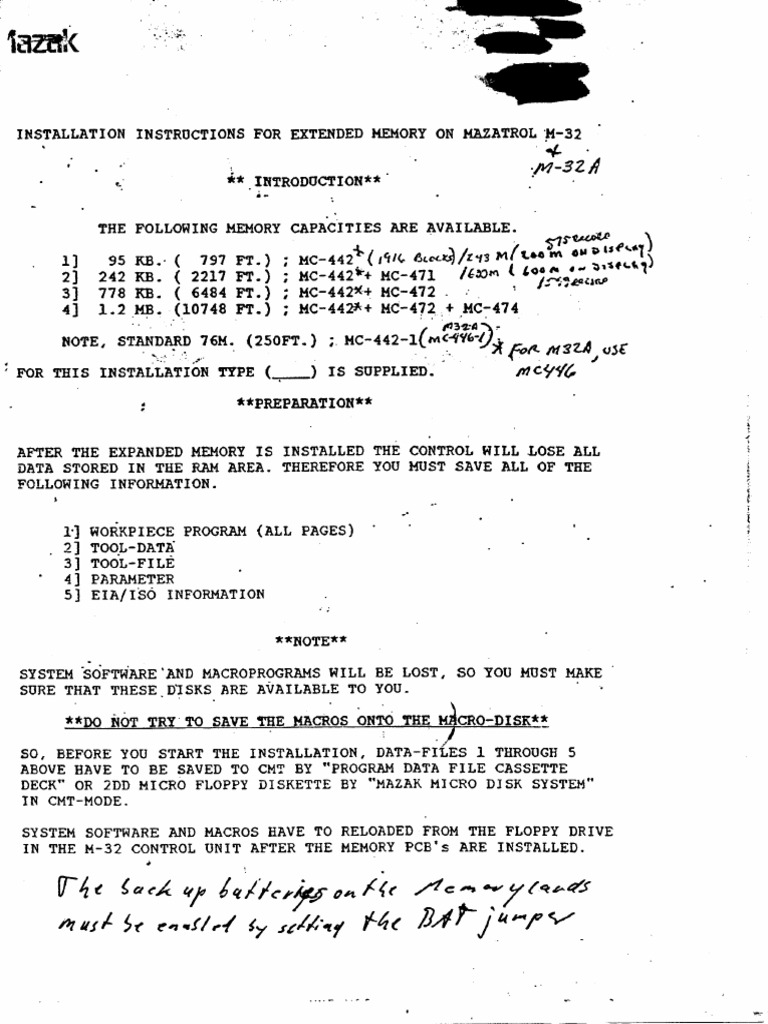 INSTALLATION INSTRUCTIONS FOR EXTENDED MEMORY ON MAZATROL M-32