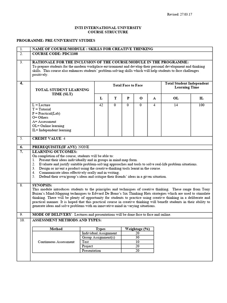 1. NAME OF COURSE/MODULE : SKILLS FOR CREATIVE THINKING