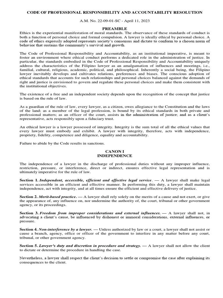 Notably, A.M. No. 22-09-01-SC, or the Code of Professional Responsibility and Accountability