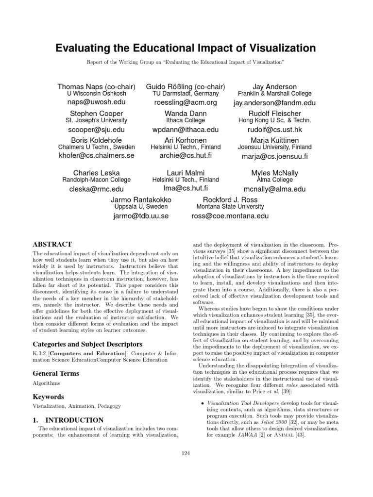 The role concept captures tacit expert knowledge in a form that can be taught to novices. Details about the project and evaluation studies can be found at [47]. CP, SO-RP. Charles Leska This study examines the impact on student performance of using visualization on a unit in a computer literacy course. The unit focuses on the binary representation of data and the interplay of the processor components during the fetch-execution cycle. Details about the study can be found at [48]. IP, SO-TS. Scott Grissom, Myles McNally, and Tom Naps This study compares the eect of three dierent learner engagement levels with visualization in a course module on introductory sorting algorithms. Results of the study have been published in [20]. CP, SO-TS. Jarmo Rantakokko This study evaluates the eects of using algorithm visualization in parallel computing. The study focuses on student learning outcomes. Details about the project and this particular study can be found at [49]. IP, SO-RP. The working groups URL [46] contains updated information on these studies and others that have been added since the preparation of this report.