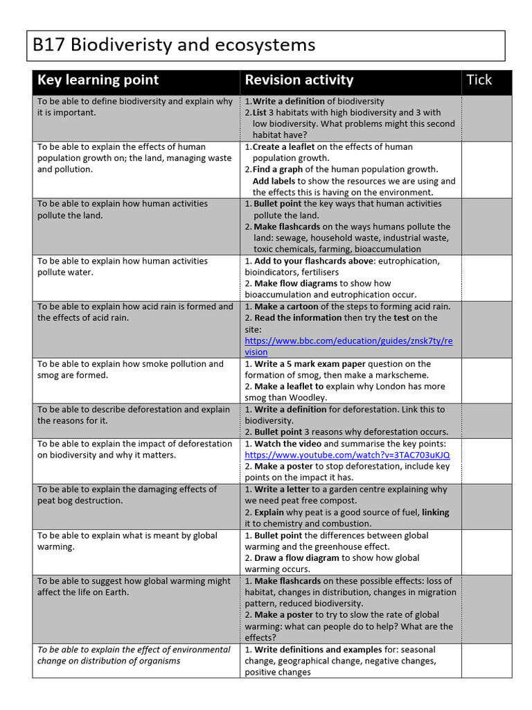 of deforestation and recycling resources. 2. Make a mindmap on biodiversity – the risks to it,