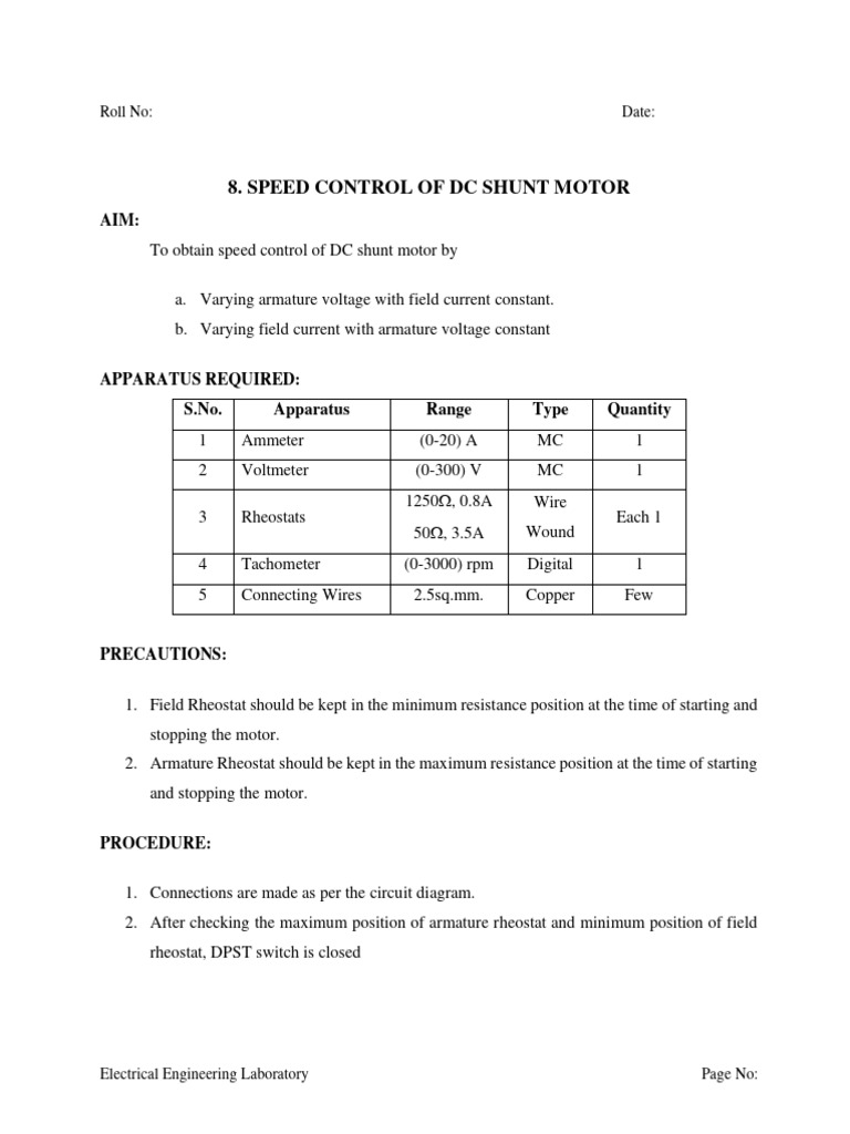 8. SPEED CONTROL OF DC SHUNT MOTOR