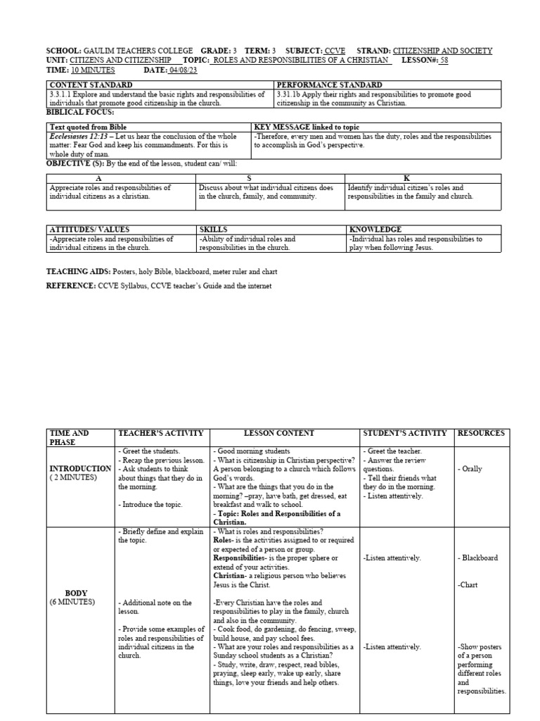 UNIT: CITIZENS AND CITIZENSHIP TOPIC: ROLES AND RESPONSIBILITIES OF A CHRISTIAN LESSON#: 58