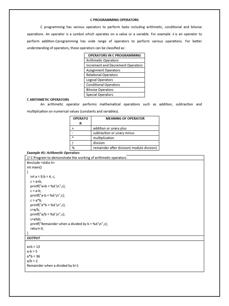 C programming has various operators to perform tasks including arithmetic, conditional and bitwise
