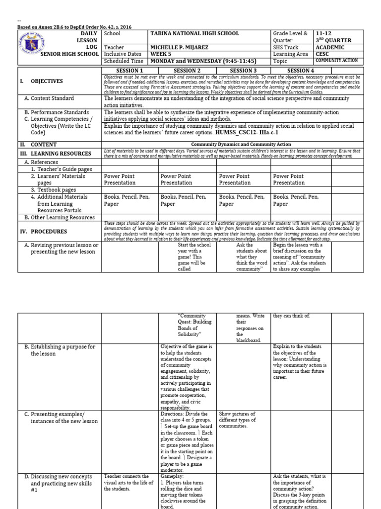 I. OBJECTIVES followed and if needed, additional lessons, exercises, and remedial activities may be done for developing content knowledge and competencies.