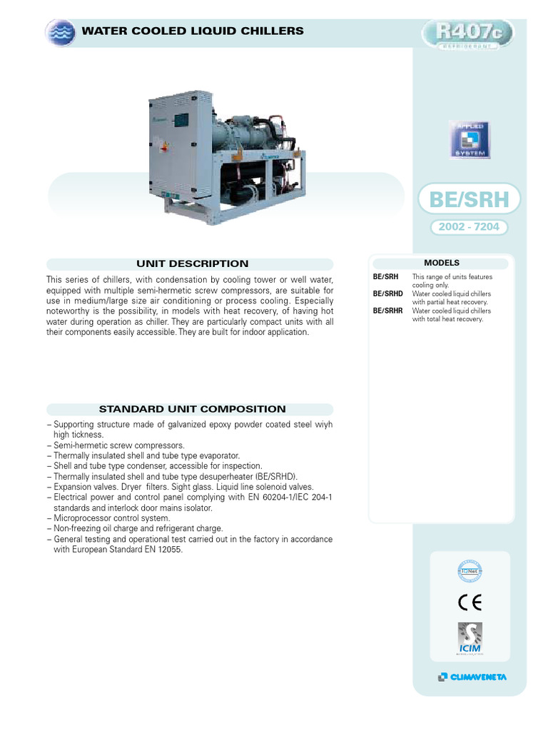 This series of chillers, with condensation by cooling tower or well water, BE/SRH This range of units features