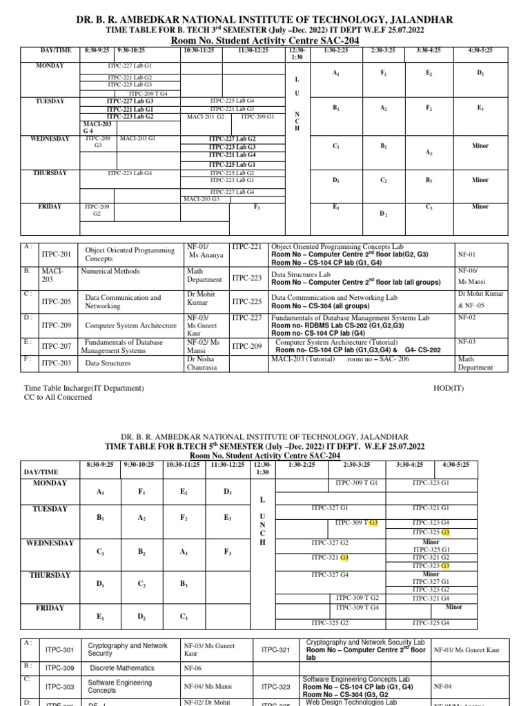 TIME TABLE FOR B. TECH 3rd SEMESTER (July –Dec. 2022) IT DEPT W.E.F 25.07.2022
