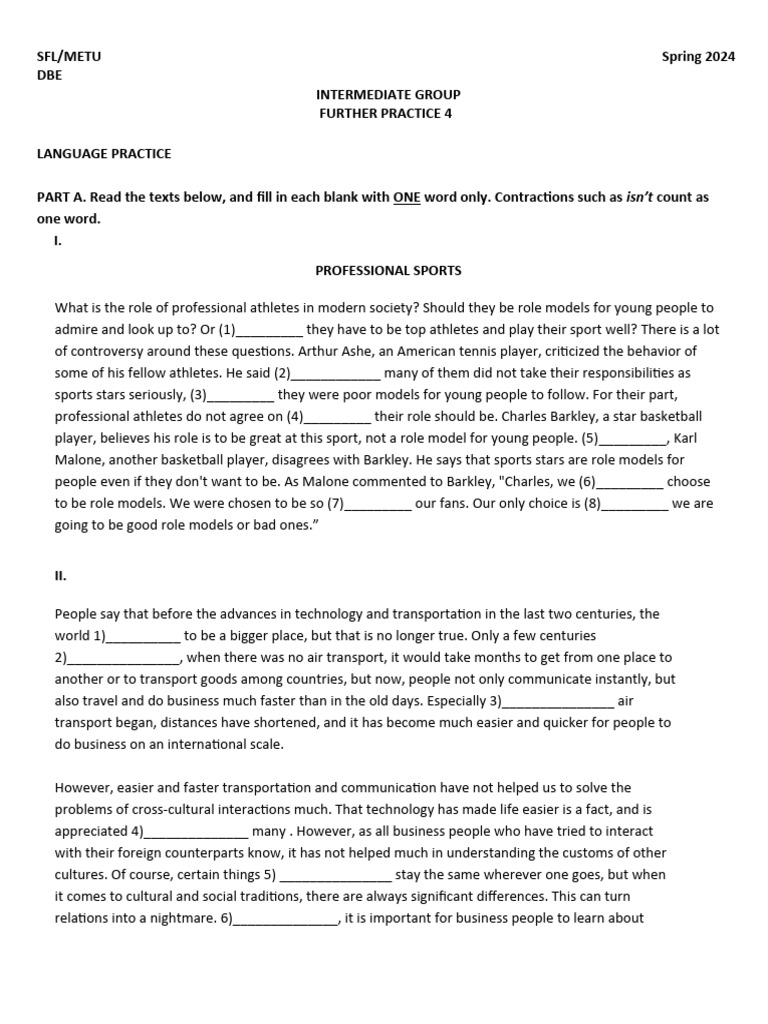 PART A. Read the texts below, and fill in each blank with ONE word only. Contractions such as isn’t count as