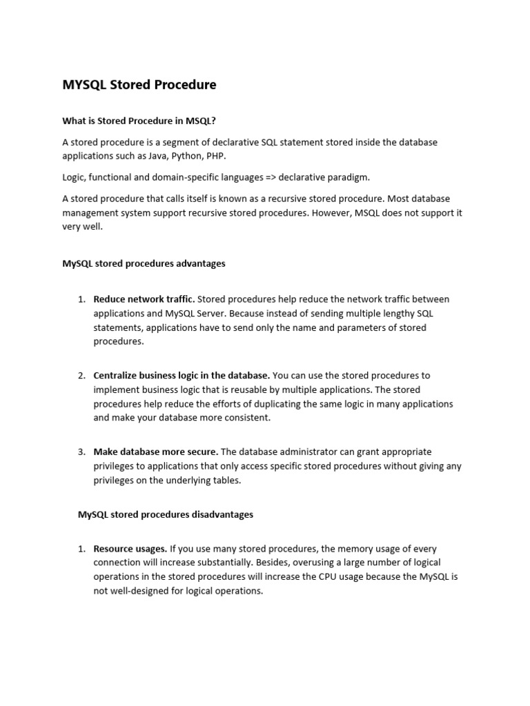 2. Troubleshooting. It’s difficult to debug stored procedures. Unfortunately, MySQL does