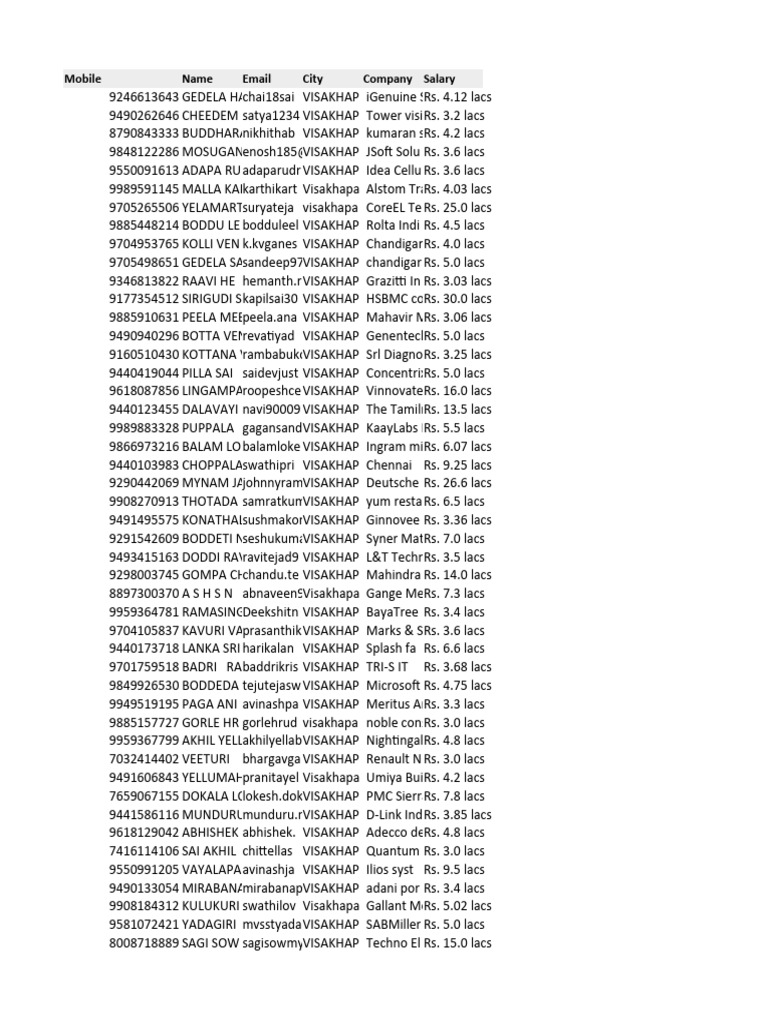 Mobile Name Email City Company Salary