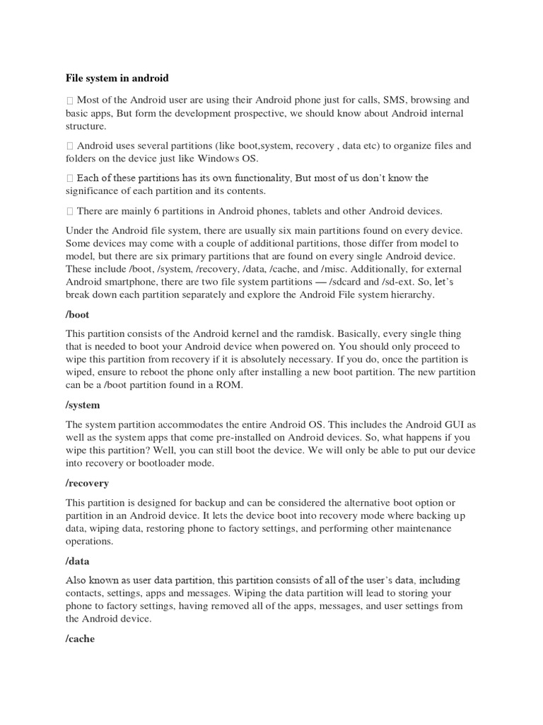 These include /boot, /system, /recovery, /data, /cache, and /misc. Additionally, for external