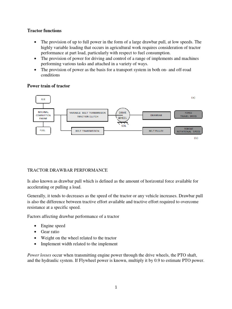 equations that take into account tire dimensions, soil conditions, slip, etc. Tractor performance is