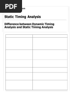 Static timing analysis is a method of validating the timing performance of a design by checking all possible paths for timing violations. PrimeTime checks for violations in the same way that you would do it manually, but with much greater speed and accuracy. To check a design for violations, PrimeTime breaks the design down into a set of timing paths, calculates the signal propagation delay along each path, and checks for violations of timing constraints inside the design and at the input/output interface. Another way to perform timing analysis is to use dynamic simulation, which determines the full behavior of the circuit for a given set of input stimulus vectors. Compared with dynamic simulation, static timing analysis is much faster because it is not necessary to simulate the logical operation of the circuit. It is also more thorough because it checks all timing paths, not just the logical conditions that are sensitized by a particular set of test vectors. However, static timing analysis can only check the timing, not the functionality, of a circuit design.