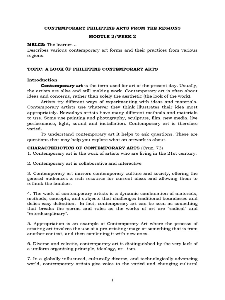 CHARACTERICTICS OF CONTEMPORARY ARTS (Cruz, 73)