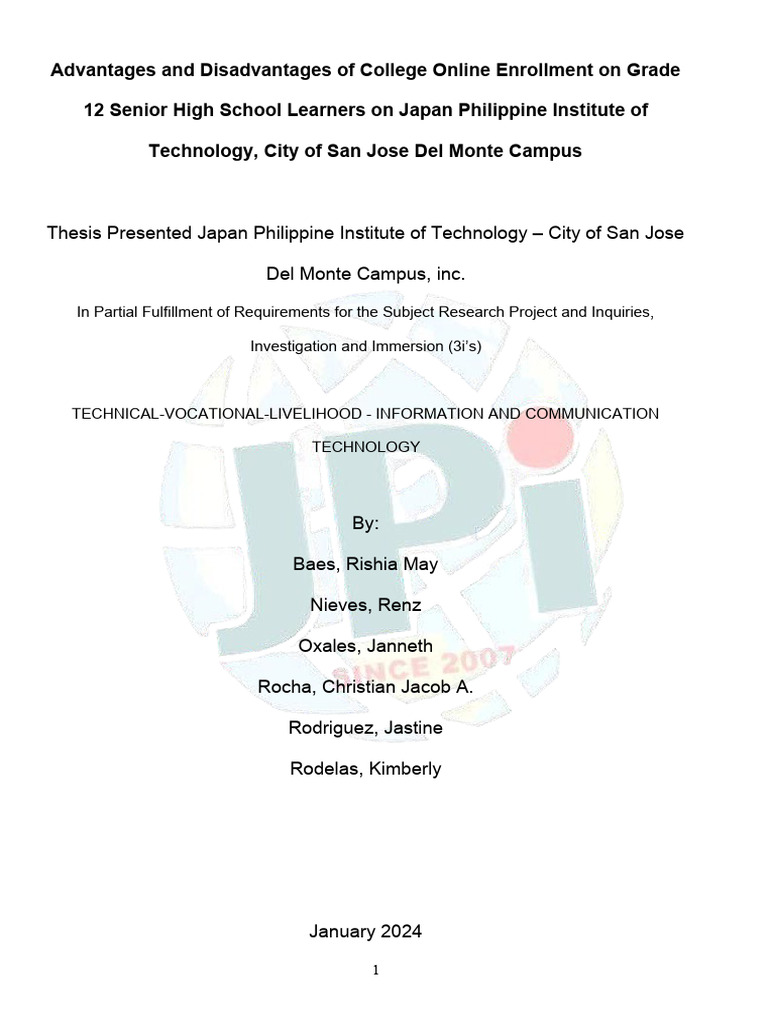 In Partial Fulfillment of Requirements for the Subject Research Project and Inquiries,
