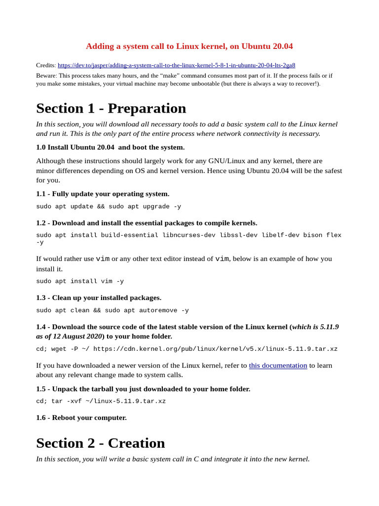 Credits: https://dev.to/jasper/adding-a-system-call-to-the-linux-kernel-5-8-1-in-ubuntu-20-04-lts-2ga8